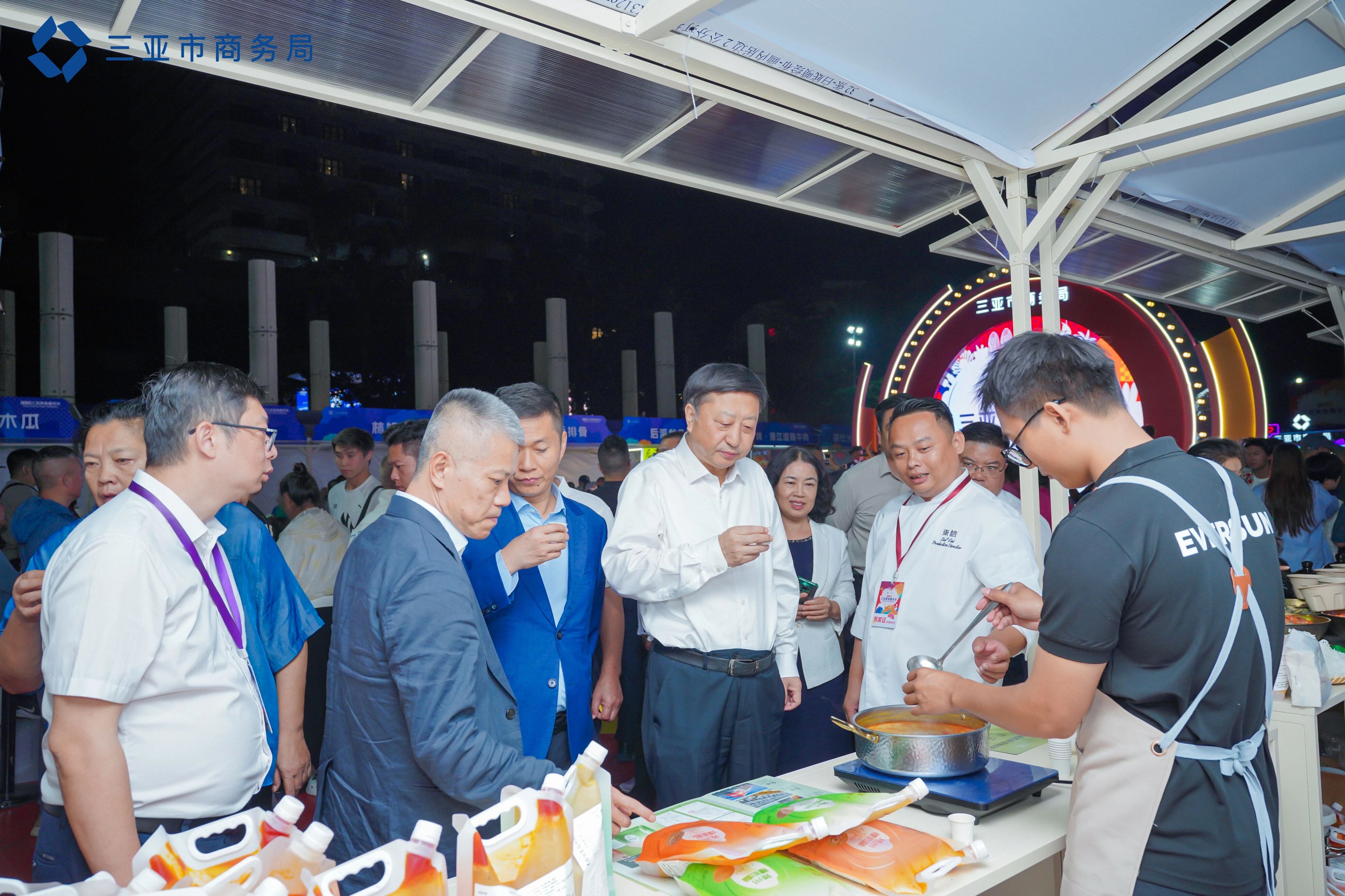 开幕式后,刘耿一行来到北京小吊梨汤、湖北蔡林记、三亚黑珍珠等美食展位,现场体验特色美味,并与获得“全国劳动模范”等国家级荣誉称号、琼菜代表人物蔡青松及相关餐饮业代表就打造“天下美食在三亚”品牌进行深入交流探讨。